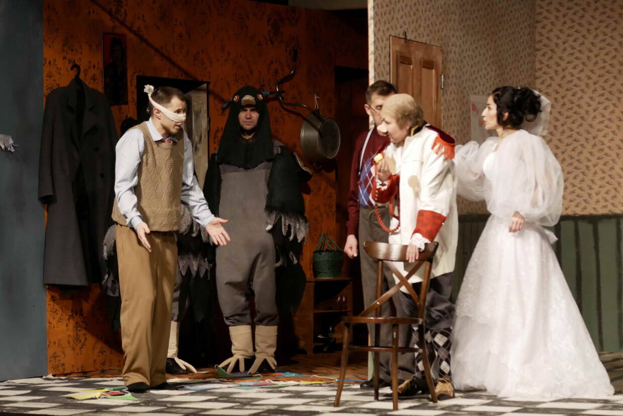Пьеса завершается свадебным финалом, абсурдно-жизнеутверждающим, где смех и слёзы сливаются воедино.