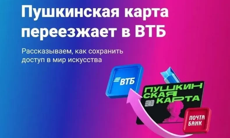 С 1 января 2026 года обслуживание «Пушкинской карты» переходит от Почта Банка к ВТБ. Чтобы сохранить доступ к программе, необходимо до 28 декабря 2025 года подать заявление на выпуск новой карты в ВТБ.
